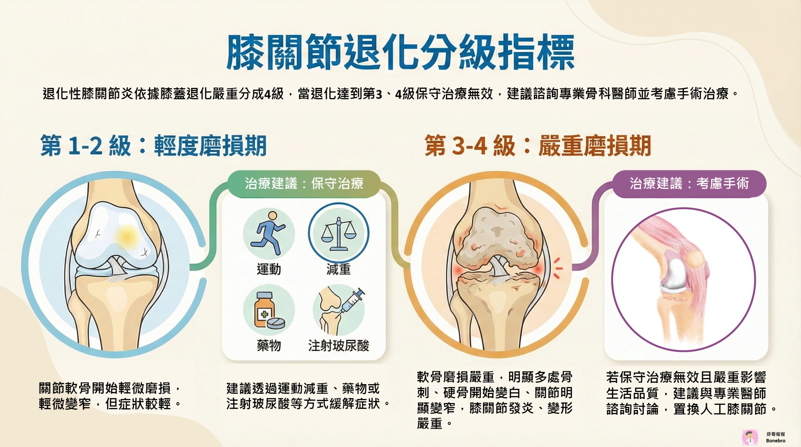 在Kellgren-Lawrence Grading Scale當中,退化性關節共分為第0級到第4級這幾個階段(參考下表),